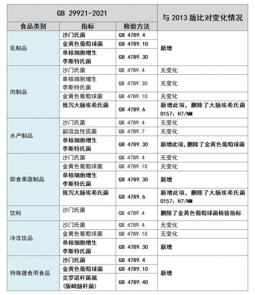 表1:《GB 29921-2021 食品安全国家标准 预包装食品中致病菌限量》变化情况